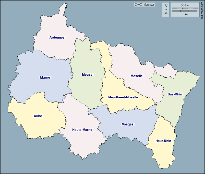Verwaltungssitz und bevölkerungsreichste Stadt ist Straßburg. Die Region Grand Est unterteilt sich in die zehn Départements Ardennes (08), Aube (10), Marne (51), Haute-Marne (52), Meurthe-et-Moselle (54), Meuse (55), Moselle (57), Bas-Rhin (67), Haut-Rhin (68) und Vosges (88).